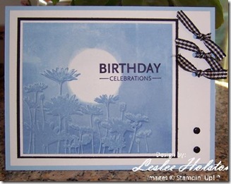 I started with a Whisper White piece of card stock. I masked the moon using a 1-3/8” circle punched Post-It® note. I brayered on Bashful Blue and then removed the mask. In Brocade Blue, I stamped the flowers from the Upsy Daisy set. Using my stamp-a-ma-jig, I offset the flowers slightly and stamped them again, this time using Whisper White Craft Ink. The sentiment is from the same set and stamped in Basic Black. I layered the image panel on Whisper White and Basic Black and then adhered to a layer of WW on Bashful Blue. A few pieces of my fav black gingham ribbon and black Vintage brads finish off the card. An awesome technique for a beautiful card!