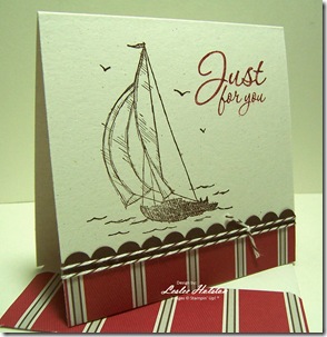 With Father’s Day in a couple of days, I have found myself reaching for this new stamp set often. Sail Away is a lovely line art stamp that can be used in a variety of ways. I showed this card at a recent workshop so I wanted to keep it super simple. I stamped the image off center in Early Espresso. The sentiment is found in the Hostess Level 1 set, Afterthoughts and is stamped in Cherry Cobbler ink. I’m going to miss this set once it retires on June 30th. :( The DSP is the lovely and very masculine Nautical Expedition paper in the Summer Mini Catalog. The Early Espresso/White Baker’s Twine can be found in the same catty. I Scallop Border punched a strip of Early Espresso card stock to off set the DSP as well. The card base is 4.25” square in Naturals White. I made a coordinating modified envelope to go along with the card. You can see how I did that in this post, Scalloped Circle Card w/ Envelope.